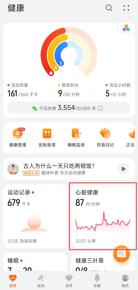 1)华为运动健康App首页-心脏健康,是否有近期心率数据;