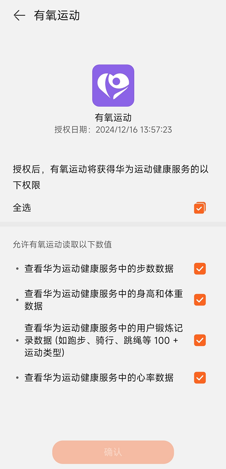 3)点击数据分享与授权:确认帐号授权应用中包含“有氧运动”;点击有氧运动,确认已给有氧运动授予所有数据权限。