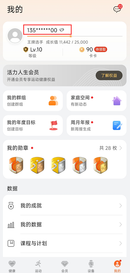打开 华为运动健康App,我的,点击顶部红框位置帐号名称,查看帐号对应的手机号,与在心有氧授权华为运动健康数据时登录的华为帐号是否一致。