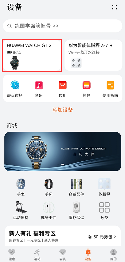 如果设备与手机的蓝牙连接已断开,请检查手机蓝牙是否开启,打开华为运动健康App-设备,重新连接。